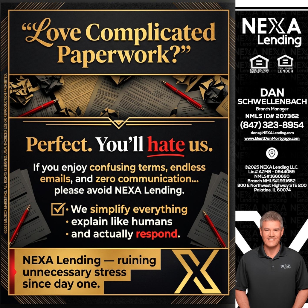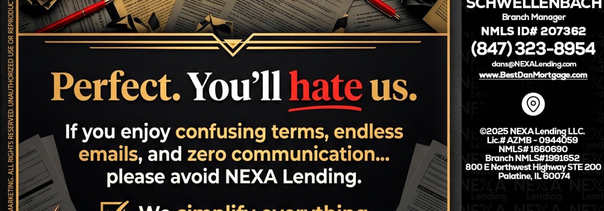 YOU WILL HATE US! - Dan Schwellenbach -Mortgage Loan OriginatorHi, my name is Dan Schwellenbach. I’m a Loan Officer with NEXA Lending LLC., offering personalized mortgage solutions, fast customized quotes, great rates and service with integrity.